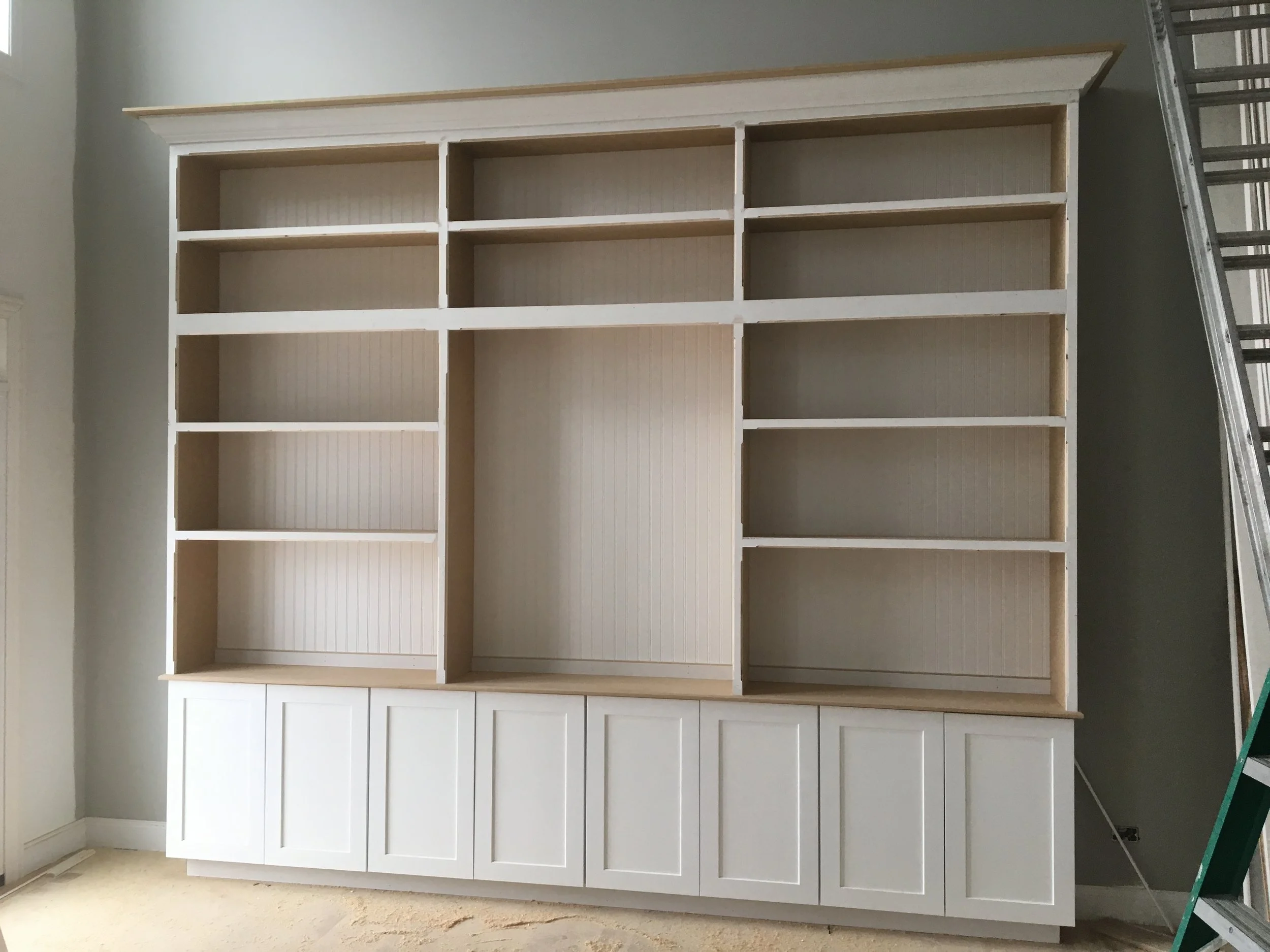 This house was styled with a full front porch, custom stained oak floors, white trim throughout, and different rooms that featured shiplap board on the walls for finishing touches. Books and reading were important to this customer, so we made them a custom bookshelf in the family room with a built-in sliding ladder. In addition to that, we built a nook desk for paperwork. The family room had a tall ceiling, while the 2nd floor had a catwalk which allowed you to enjoy the view of the family room below while walking upstairs. Entertaining guests was also important to this client, so the house we built has a large open floor plan with an upgraded kitchen for plenty of room for guests.